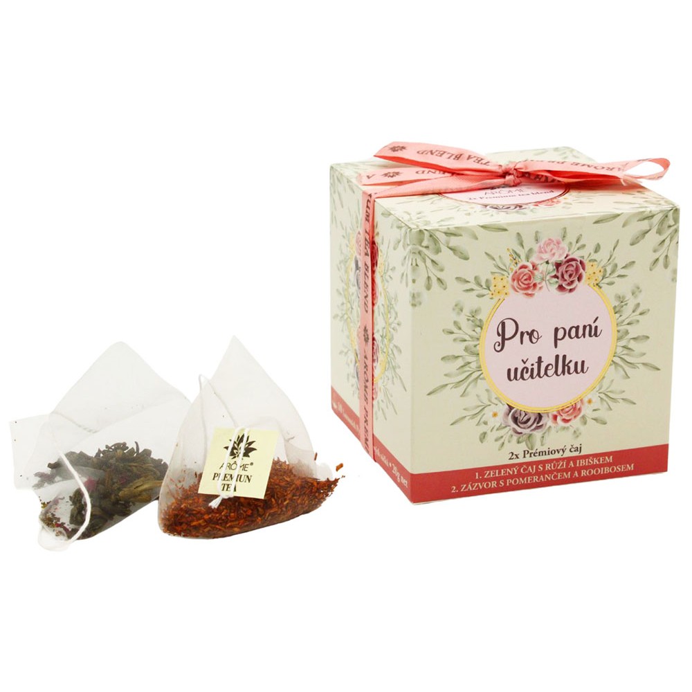 Prémiový zelený čaj zo Srí Lanky s dvoma rôznymi ovocnými príchuťami. Päť čajových vrecúšok z každej príchute je zabalených vo farebnej kvetinovej škatuľke s logom For Pani Teacher.Najlepší darček pre vašu obľúbenú učiteľku na konci školského roka alebo k narodeninám.