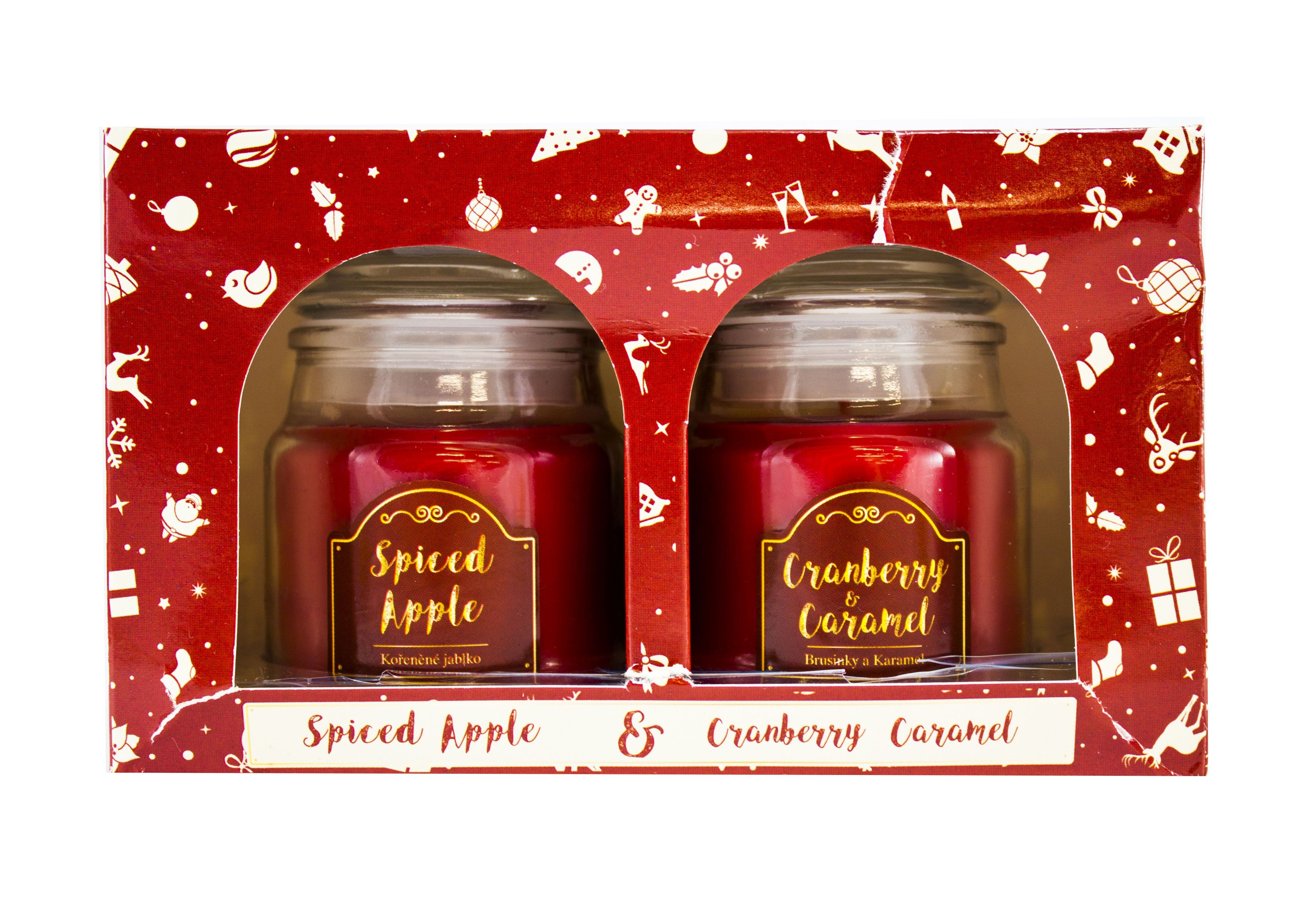 Vianočná sklenená sviečka s tesniacim viečkom - dodávaná v sade 2 ks - Jedna sviečka s vôňou Spiced Apple a druhá s vôňou Cranberry & Caramel.