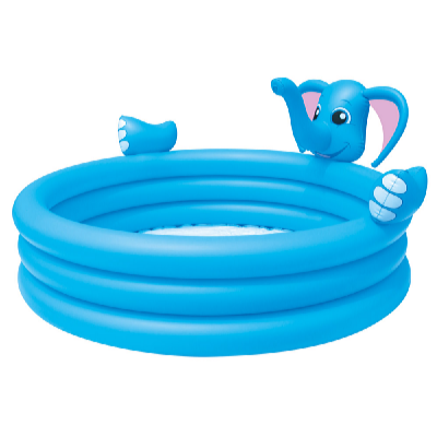 Kruhový detský bazén s tromi nafukovacími kruhmi a sprchou v chobote slona po pripojení na záhradnú hadicu.