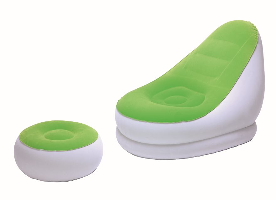 Nafukovacie kreslo s podnožkou na nohy, ktoré zabezpečí ešte väčšie pohodlie pri relaxácii. Kreslo je vyrobené z vinylu so semišovou vodoodolnou úpravou. Tvar kresla umožňuje veľmi pohodlné sedenie a relaxáciu. Rozdelené vnútorné komory zabezpečujú rovnomerné rozloženie vzduchu, vďaka čomu je kreslo po nafúknutí úplne ploché a pevné. Nafukovacie kreslo je vhodné na použitie v interiéri aj exteriéri.