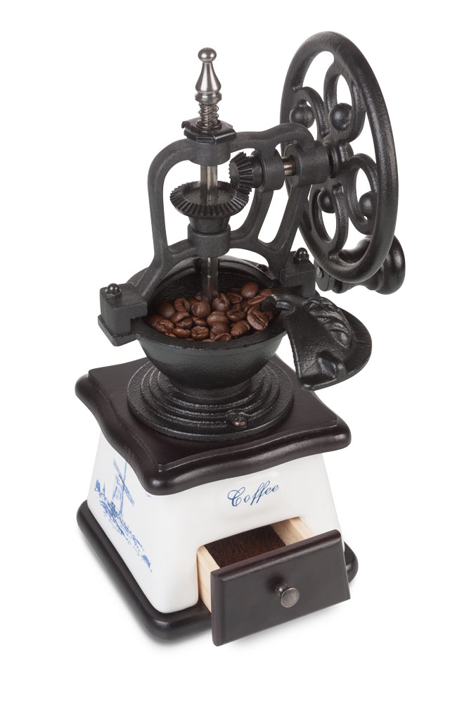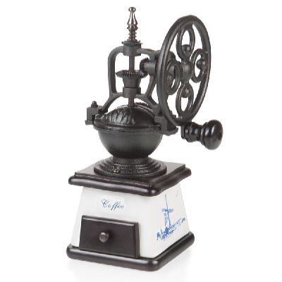 Ručný mlynček na zrnkovú kávu v retro štýle s nastaviteľnou hrubosťou mletia.