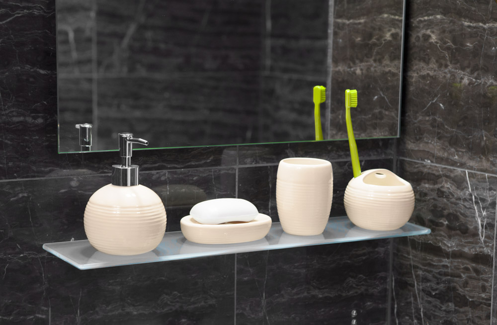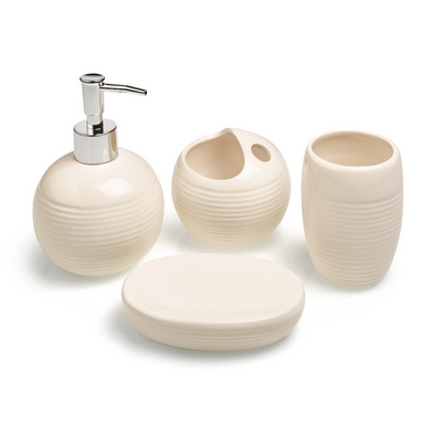 Kúpeľňová súprava z keramiky - elegantný a praktický doplnok vašej kúpeľne. Keramická kúpeľňová súprava má nadčasový dizajn - je vhodná do každej kúpeľne. Kúpeľňová súprava je vyrobená z bielej keramiky a je zdobená jemným vzorom - prúžkami.